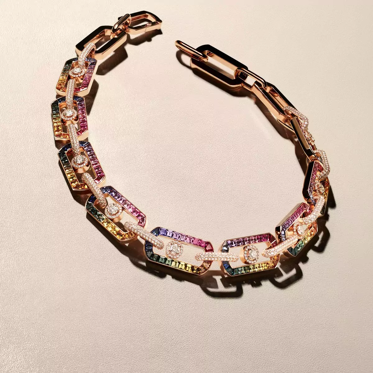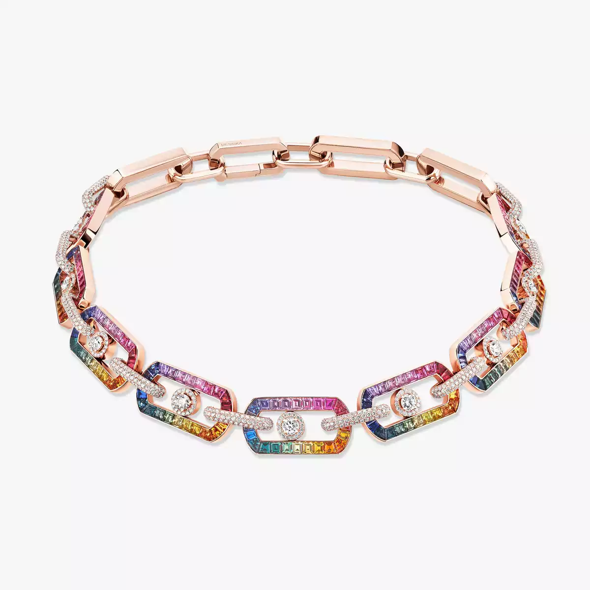 Une icône réinventée en un collier rainbow exclusif. Inspirée par l'incandescence des ciels d’Afrique australe et l’énergie vibrante de New York, Valérie Messika ose la puissance vive des pierres précieuses de couleur. Un geste inédit, qui relie nature et modernité en un dégradé parfait de 24 nuances de saphirs et de rubis. Chaque maillon en or rose 18 carats révèle une architecture chromatique millimétrée dans une harmonie parfaite. Un travail sur la couleur et la lumière spectaculaire sublimé par le mouvement des diamants de centre et la brillance enveloppante du serti écrin des inter-maillons. Pièce unique de Haute Joaillerie, So Move Rainbow est une signature lumineuse qui se ressent autant qu’elle s’admire. Une expérience où la couleur devient éclat, énergie et émotion.