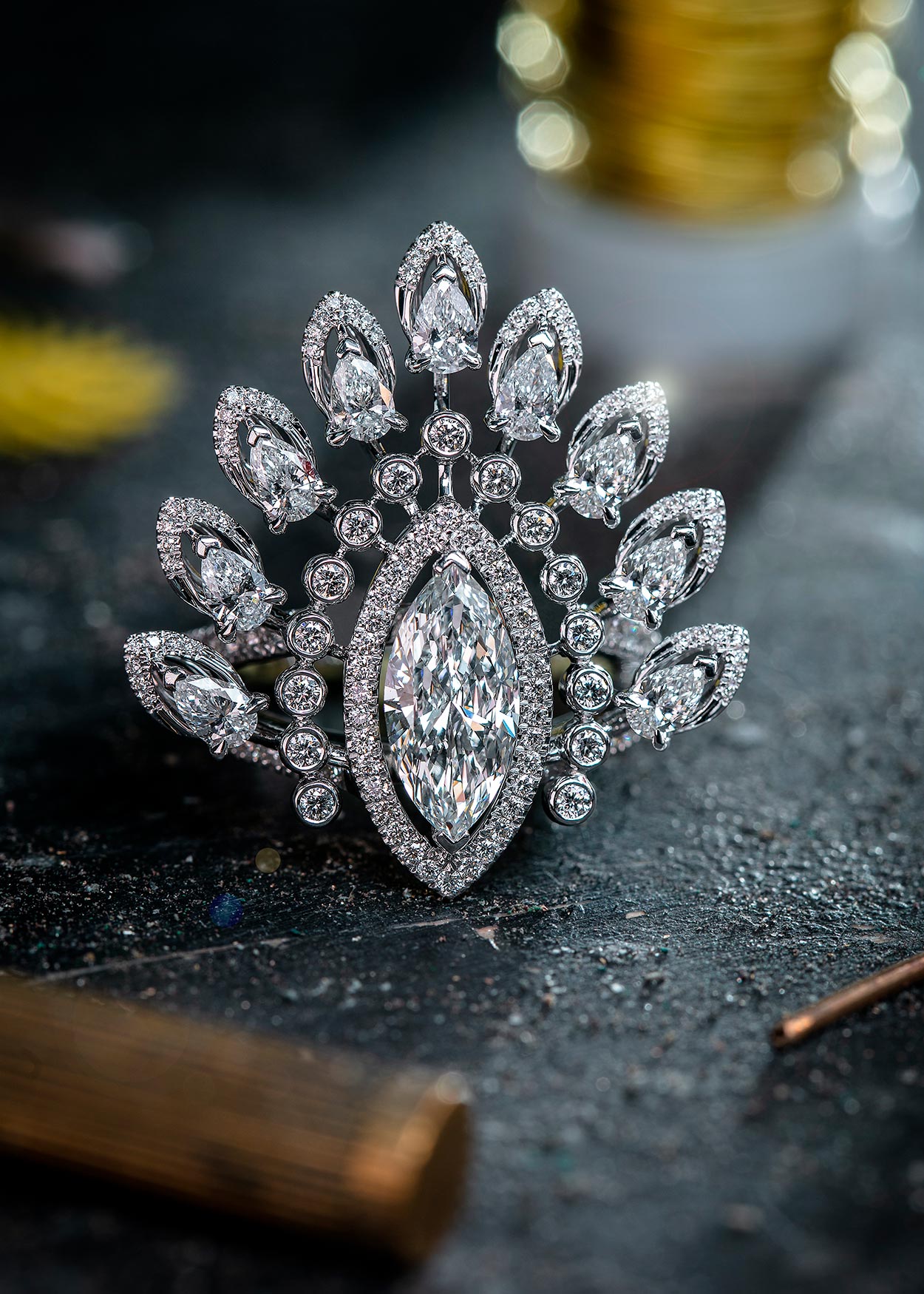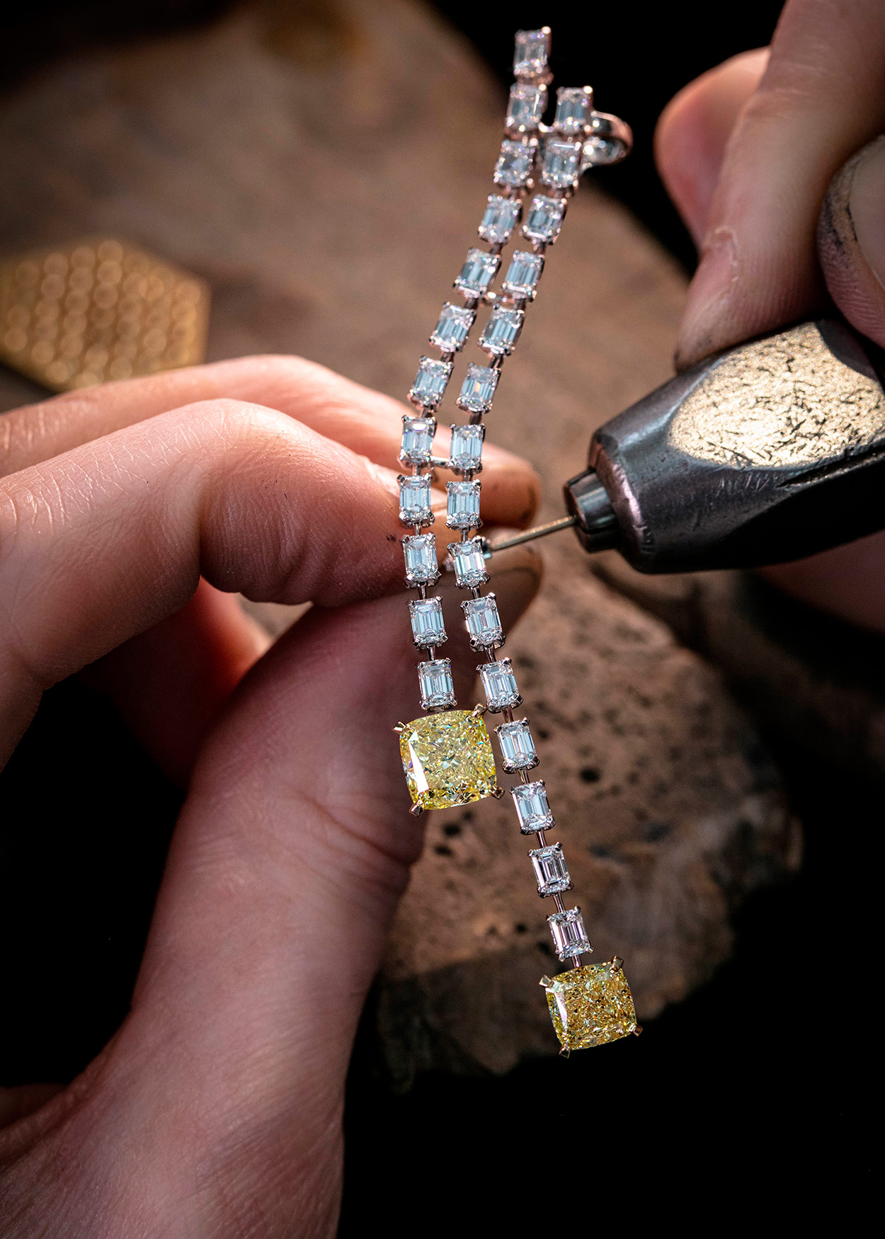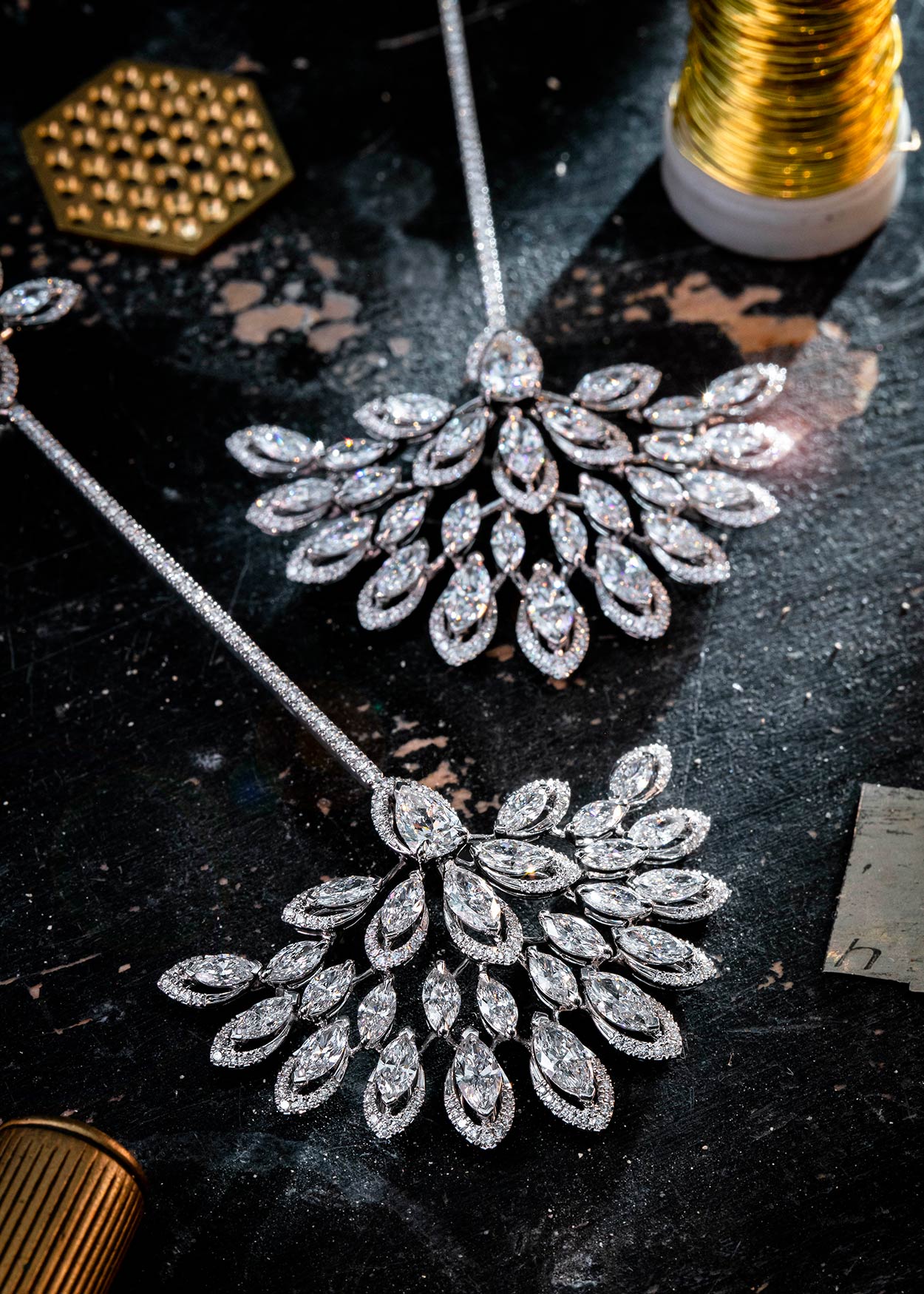 一般有两种情况:根据Valérie Messika选择的钻石创造珠宝作品,或者根据品牌设计师绘制的草图打造作品。接着,珠宝师会用金质制作初样,以确定作品的结构和形状,同时对必要部件进行抛光并确定最佳镶嵌角度。如果作品构造过于复杂,我们还会手工打造银质模型或采用3D软件。之后需对结构进行加工和润饰,直至达到设计师和艺术总监所期望的结果。
