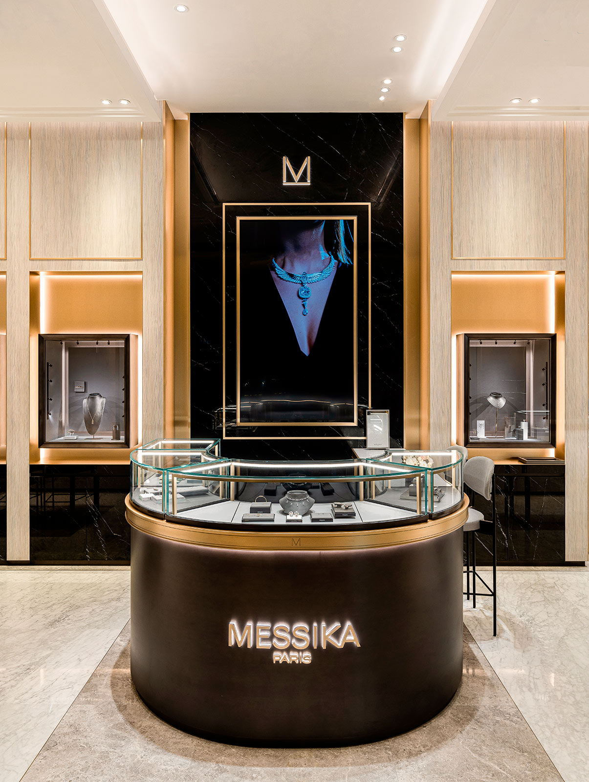 当顾客走进专卖店时,映入眼帘的黑白大理石和金色组合诠释了Messika梅西卡的美学风格——摩登、当代、优雅。对称设计、透明橱窗和所有精致细节都令金质钻饰珠宝的耀眼光芒尽情绽放。