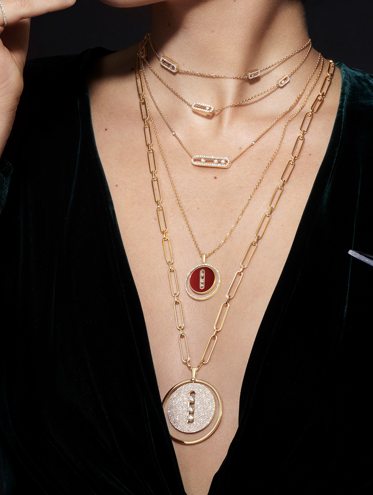 我们的精选项链 在圣诞节,一切都必须熠熠闪烁!您的颈部亦是如此,一条以K金和珍贵钻石打造的项链萦绕颈间,绽现璀璨华彩。通过和谐搭配不同长度的钻石珠宝,彰显您优雅、叛逆和果敢的魅力,吊坠、圆形饰牌和其他护身符珠宝可令您的肌肤焕发迷人光彩;亦为您的服装造型锦上添花。 准备好迎接您的挚爱和……圣诞老人:Messika梅西卡珠宝和高级珠宝品牌祝您欢度佳节!