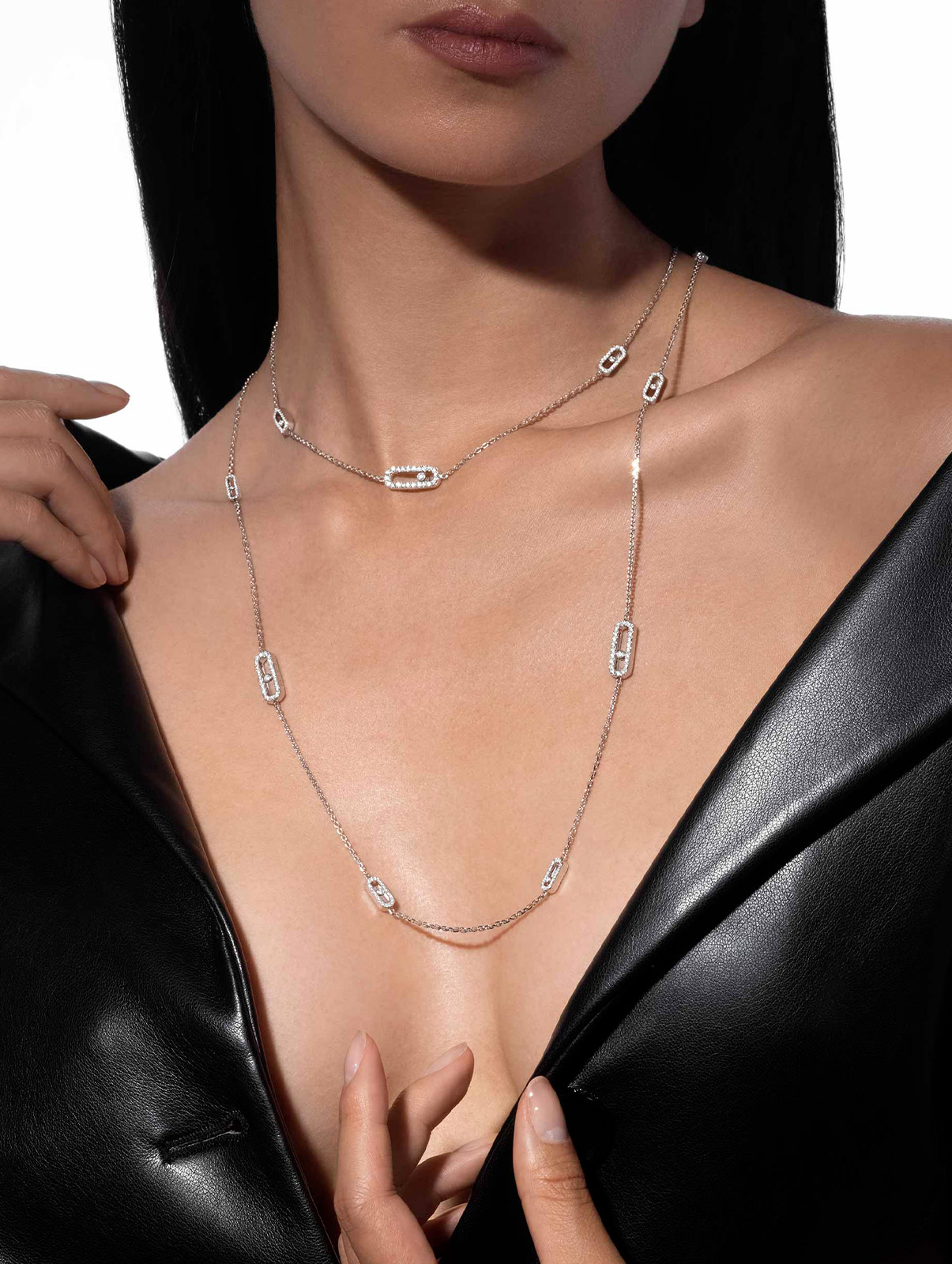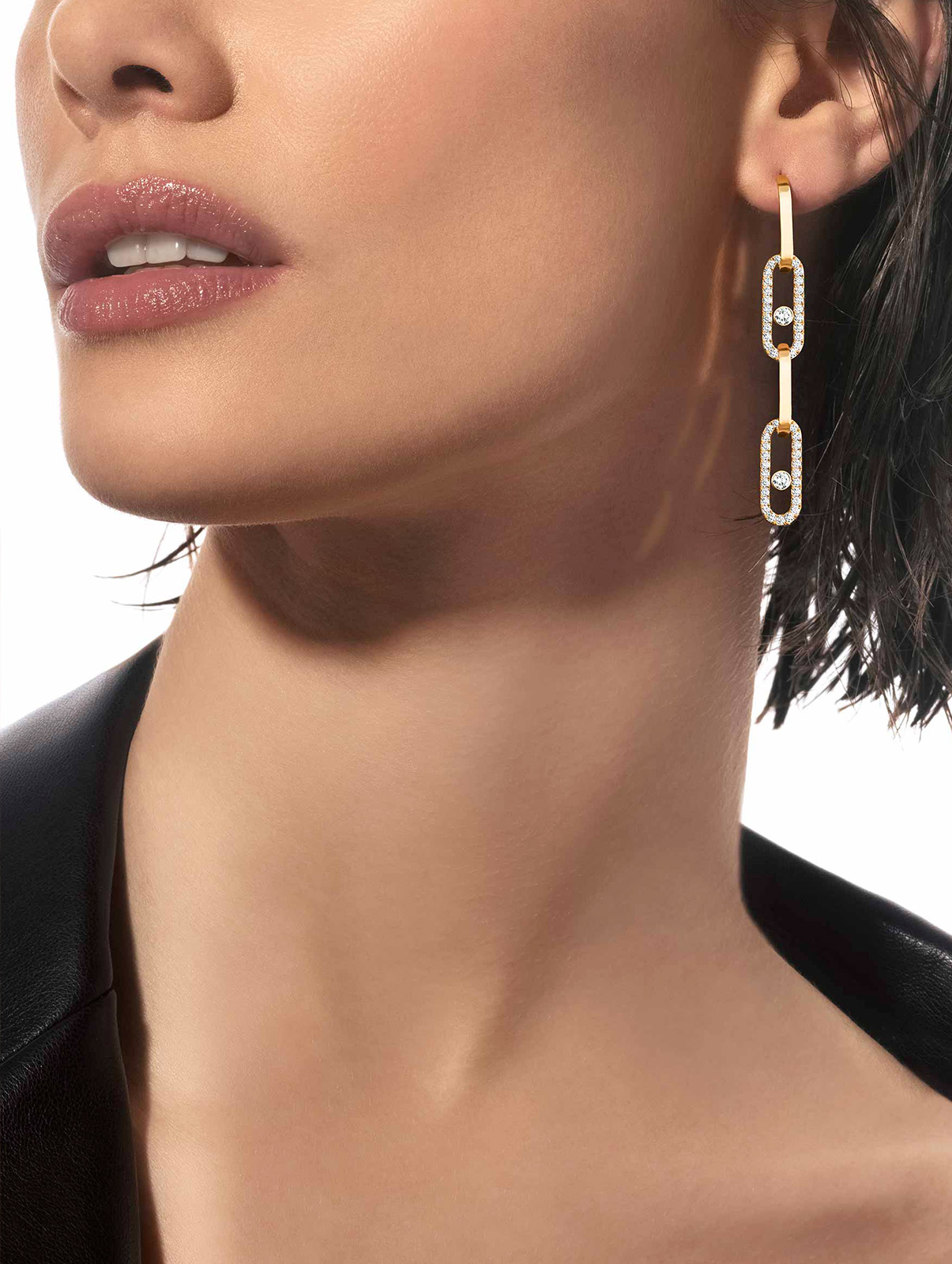 搭配、叠戴、变化……Messika梅西卡钻石珠宝永远令人耳目一新。正如全新Move Link可变换耳环:简约吊坠适合日常佩戴,较长耳环则适合打造精致考究造型。亦可选择别具魅力的My Twin Toi & Moi耳环(2颗0.15克拉钻石):这款珍贵珠宝设有多个孔眼,可只佩戴耳钉,或让点缀梨形切割钻石的精致耳饰元素闪耀于耳垂后方。最后,Move Uno长项链拥有单圈或双圈两种佩戴方式,为您的造型绘上点睛之笔。
