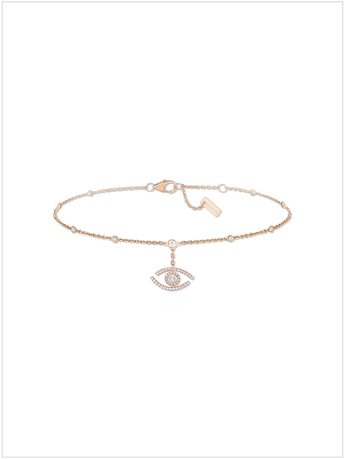 Lucky Eye钻石脚踝链非常适合在阳光明媚的天气佩戴,钻石光环将提升您脚踝的美感。每走一步,由Messika梅西卡演绎的幸运符眼眸都会带来波光粼粼般的迷人光泽。这款钻石脚踝链令人一见倾心!小细节,大不同?链条上点缀的钻石令脚踝链更加闪耀夺目。一款在引领当下珠宝潮流中的女士钻石珠宝