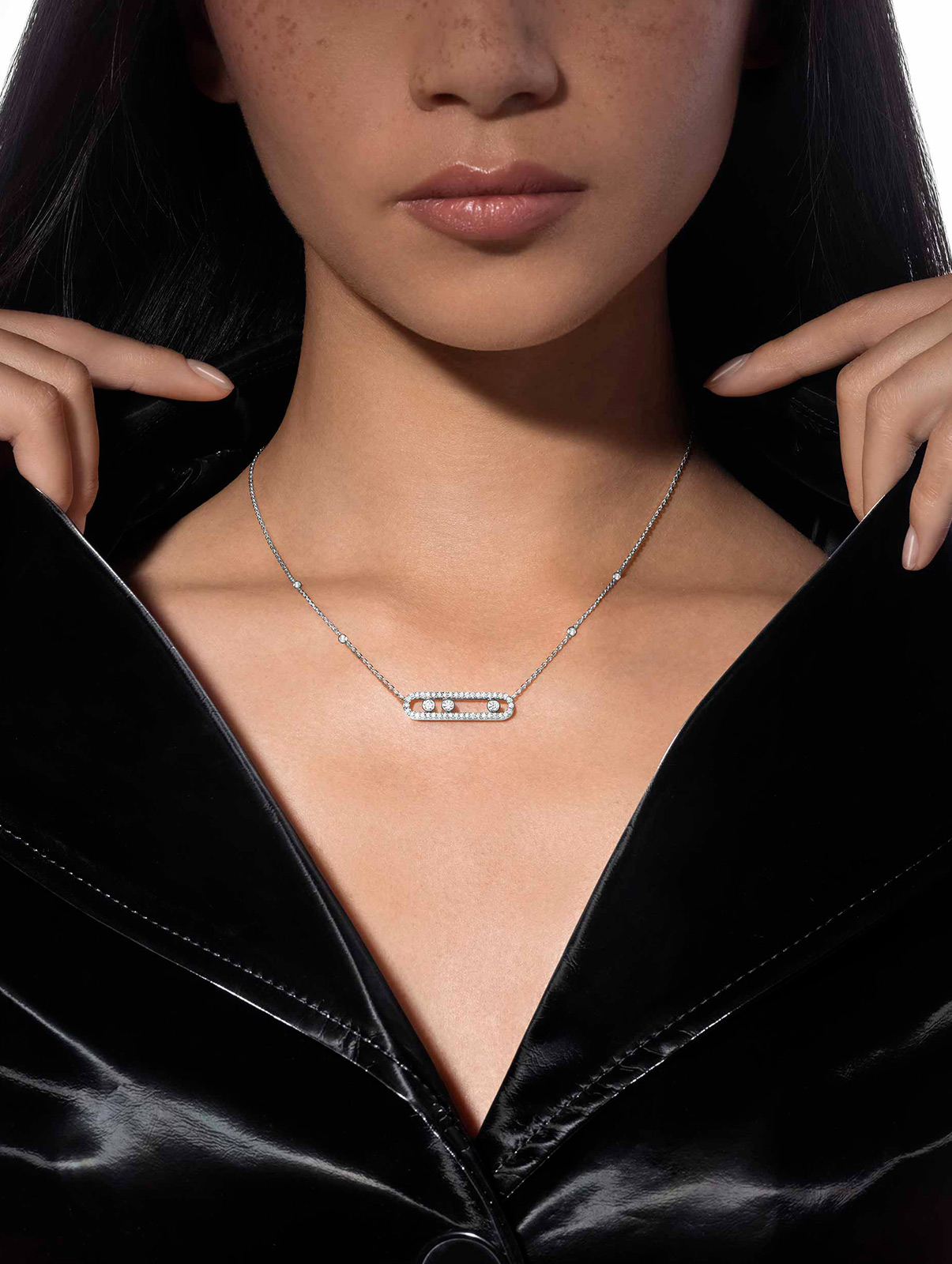 叠搭钻石项链,玩转妙趣对比,打造现代自信造型。以Signature Move Uno白金项链修饰头部轮廓,沉醉于这款钻石珠宝的迷人魅力,纤细金链上点缀精美的密镶钻石Move框架,框架内装饰一颗封闭式镶嵌钻石,随着佩戴者的一举一动而自由滑动,璀璨生辉。为了增添立体层次感,亦可搭配另一条Move Classique钻石项链,它拥有别致的五枚调节圆环。这款奢华项链极富现代气息,三颗活动钻石灵动闪耀,可谓令人一见倾心的金质钻石珠宝。