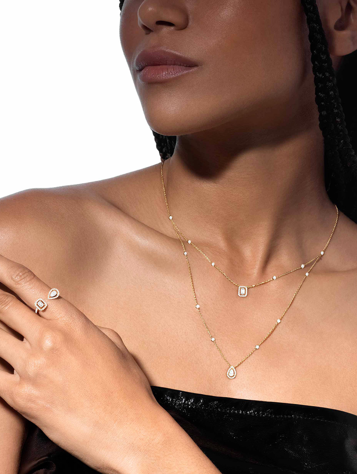 不同金质在您的颈间交织出珍贵华美的细腻色调,叠戴项链散发动人魅力,点亮令您的脸庞与造型。黄金或玫瑰金适合暖色调肌肤,白金和玫瑰金适合冷色调肌肤,然而叠戴艺术并无固定规则!无论您个性内敛恬静,还是张扬热烈,都能根据自身个性、造型和风格,随心叠戴Messika梅西卡金质钻石项链。