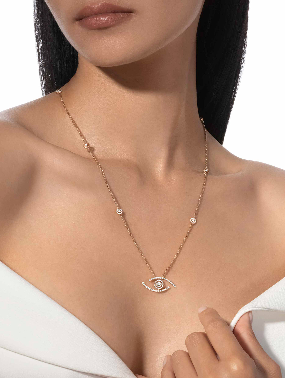 Lucky Eye玫瑰金钻石长项链既可佩戴于衬衫之外,亦可搭配低领装。纤长链条下方搭配一枚幸运符吊坠,精致铺镶线条勾勒出守护之眼图案。何不再佩戴另一条D-Vibes黄金钻石短项链,它配备巧妙的滑动系统,可轻松变身为颈圈:玩转长度变化,打造层次丰富的叠戴造型!