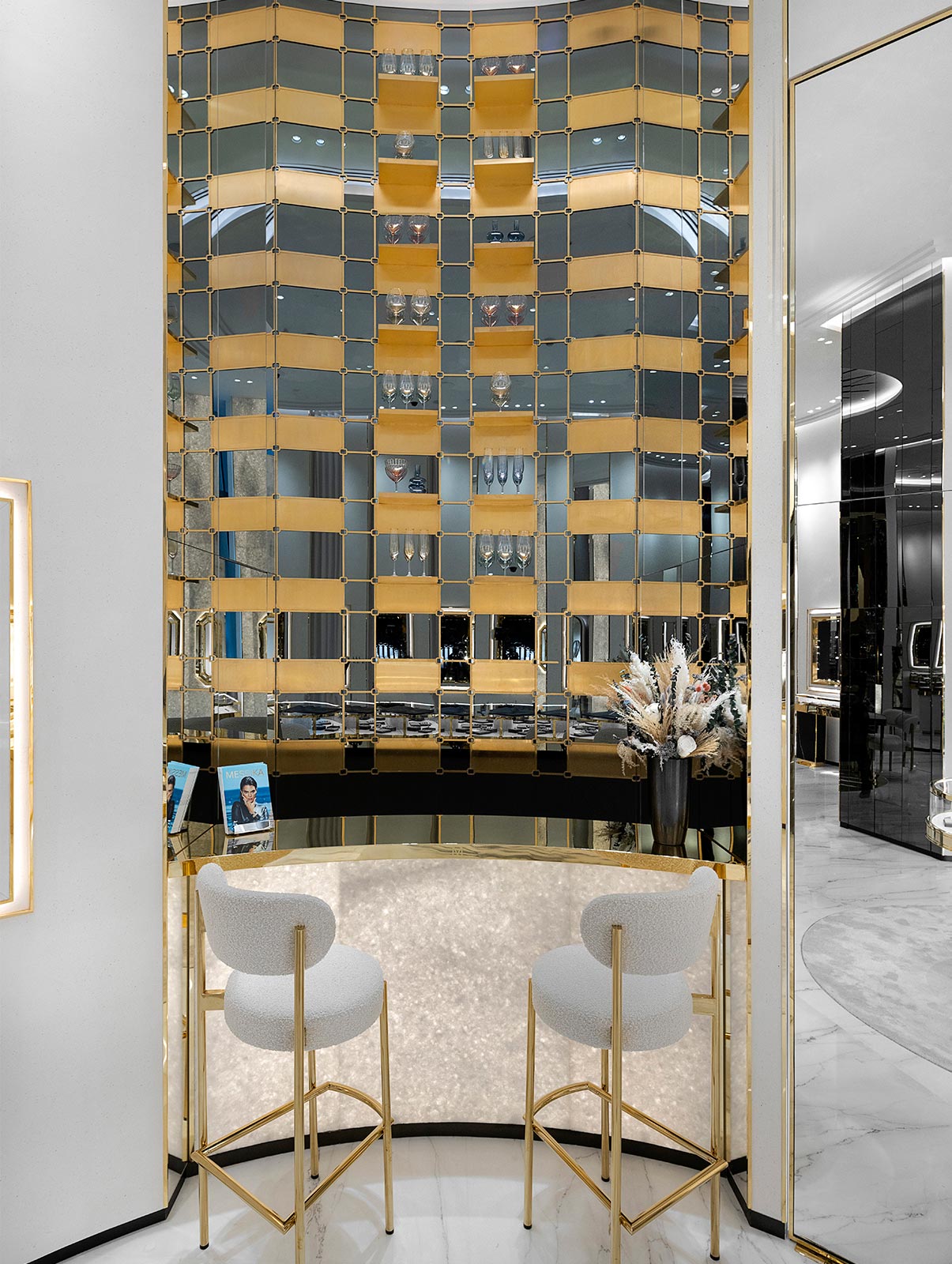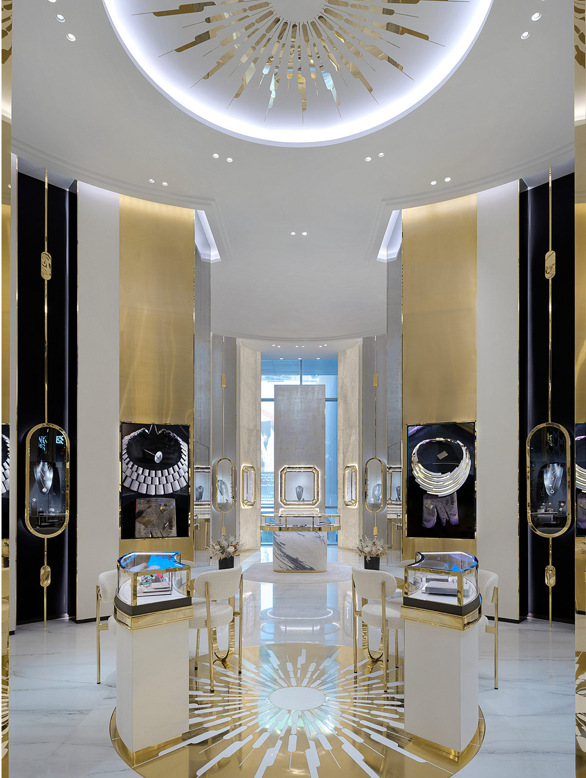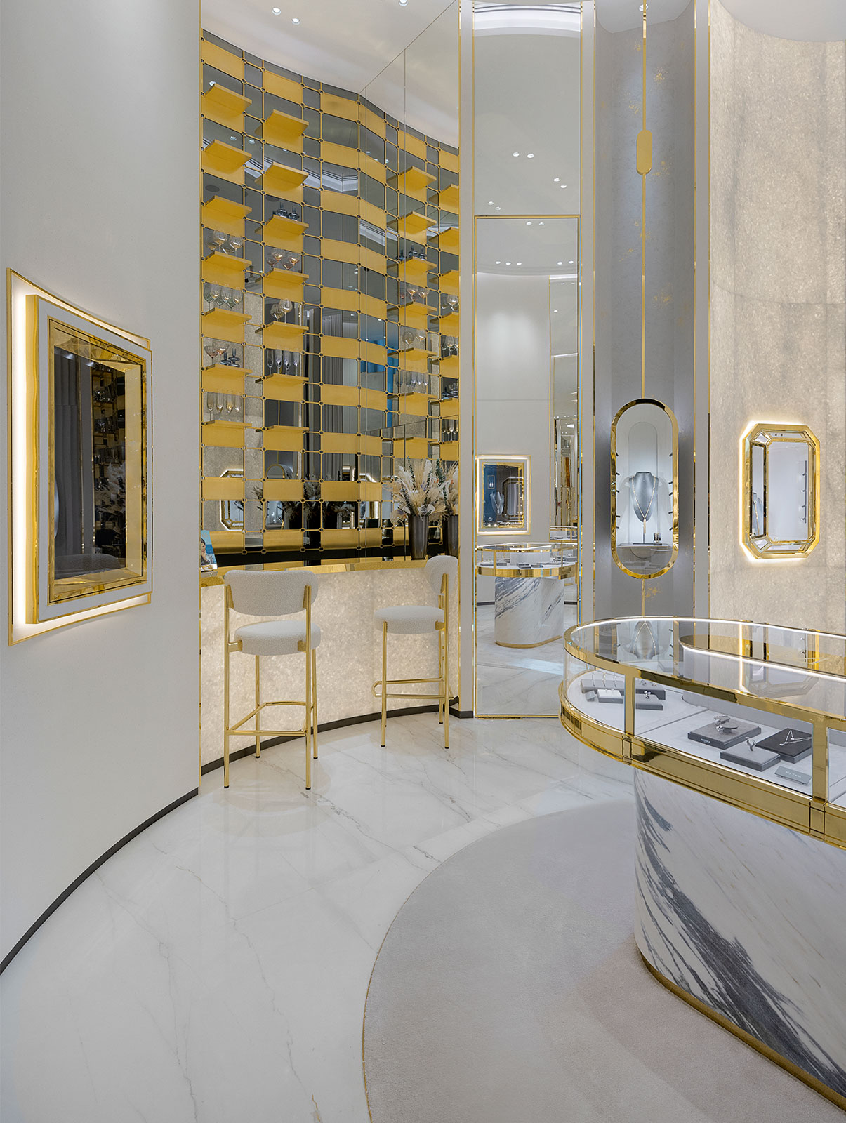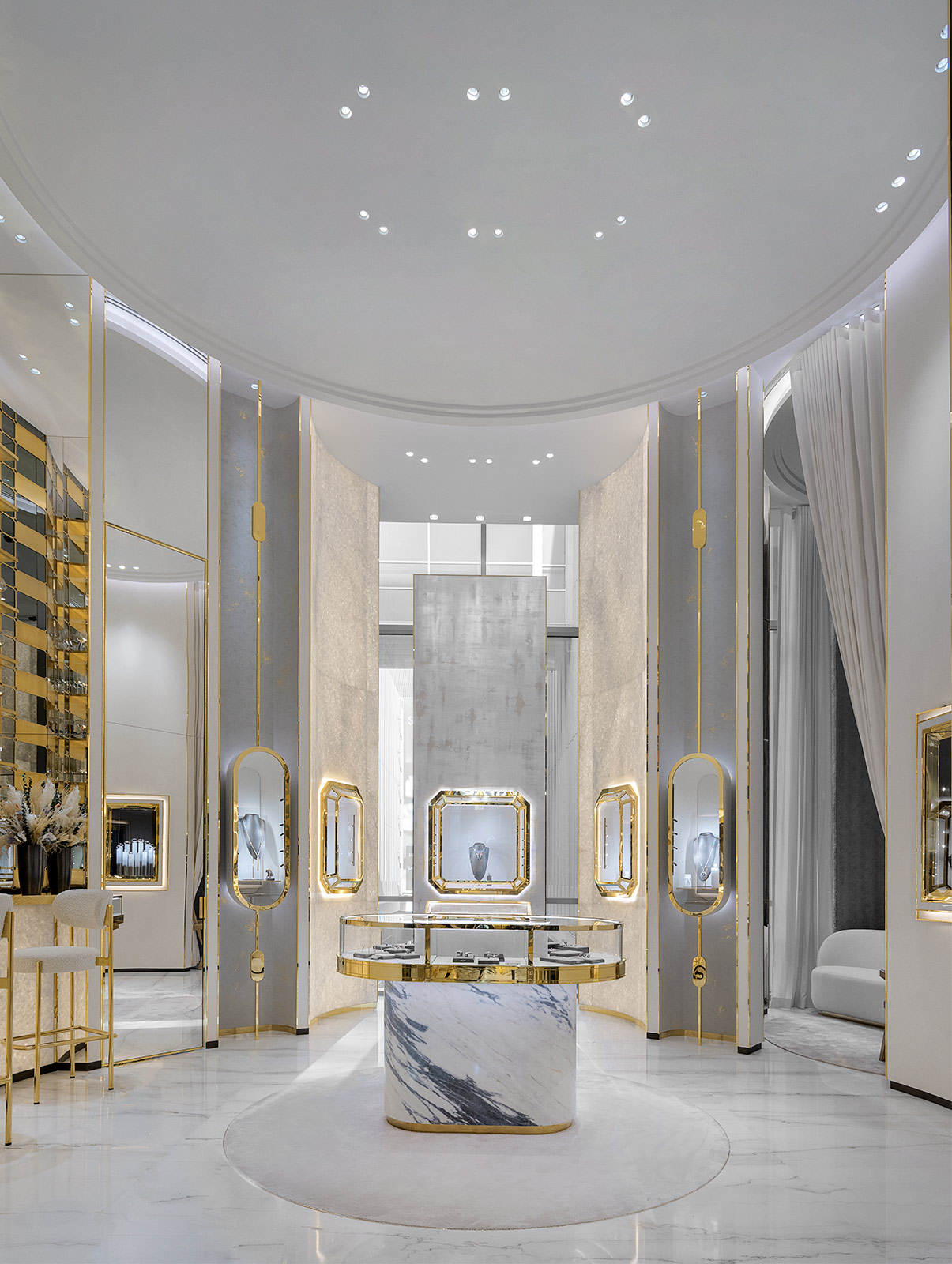 它由品牌设计师Valérie Messika构思,店内装潢运用极简美学,与气势恢宏的天顶和醒目线条相得益彰,兼具现代气质与精巧创意。白色大理石搭配雪花石,镀金金属细节呼应斜面镜子,这些元素无不彰显出Messika梅西卡超越传统珠宝设计,以精湛工艺重新定义奢华内涵的理念。