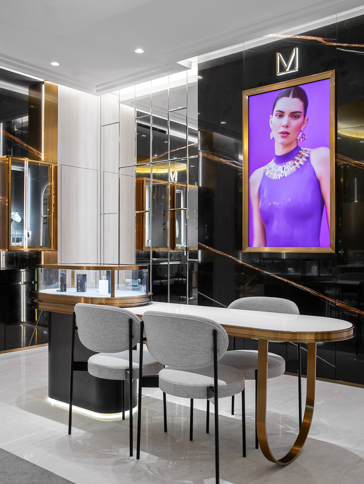 在65平方米的珍贵空间里,各处可见Messika梅西卡标志性元素。专卖店内的熠熠金光与璀璨钻石营造出奢华氛围,邀请顾客尽情欣赏Messika梅西卡珠宝杰作的迷人光芒。洋溢现代与温馨气息的建筑风格,点缀金色与黑色装饰,与黑白相间的大理石和谐搭配,带来绝佳购物体验。Valérie Messika钟爱的装饰艺术风格为整体空间注入独特美感,散发法式生活艺术气息。