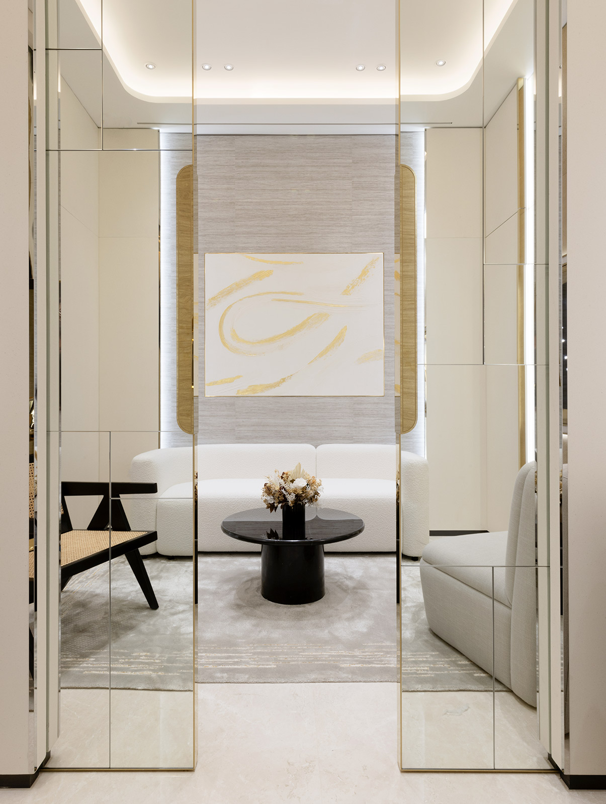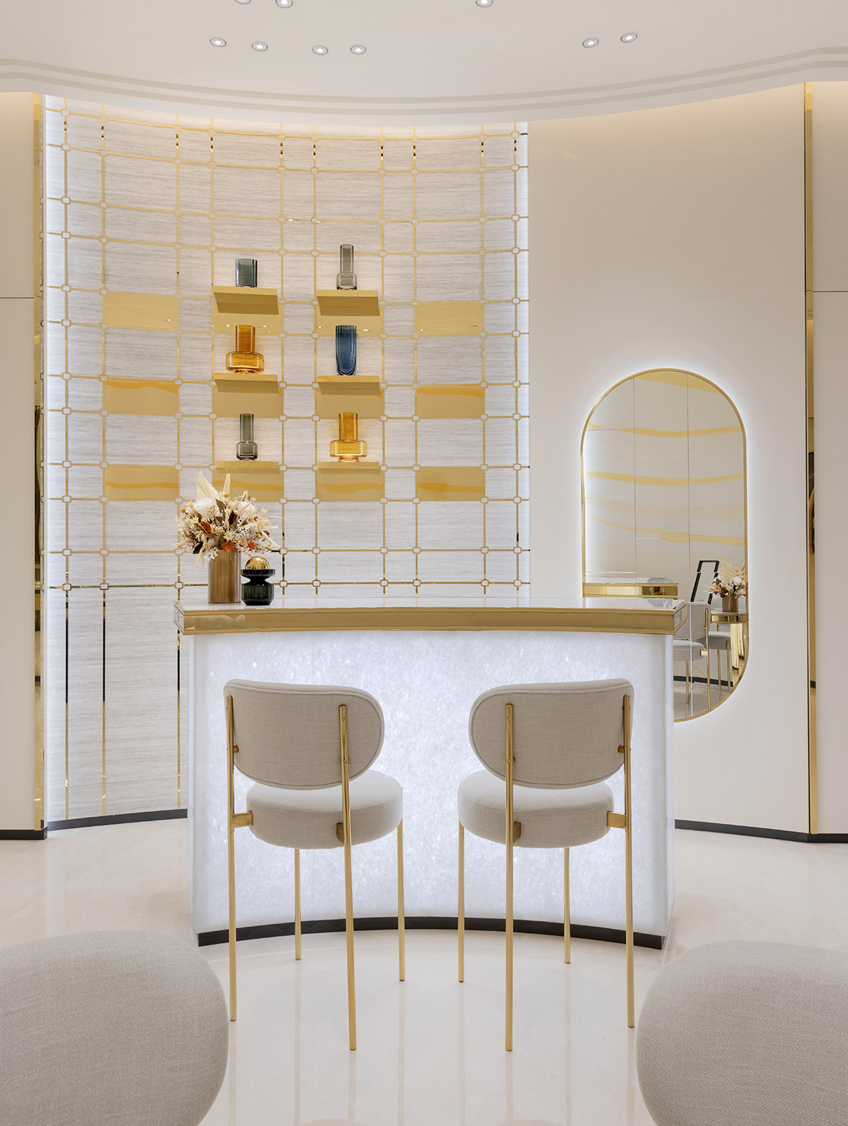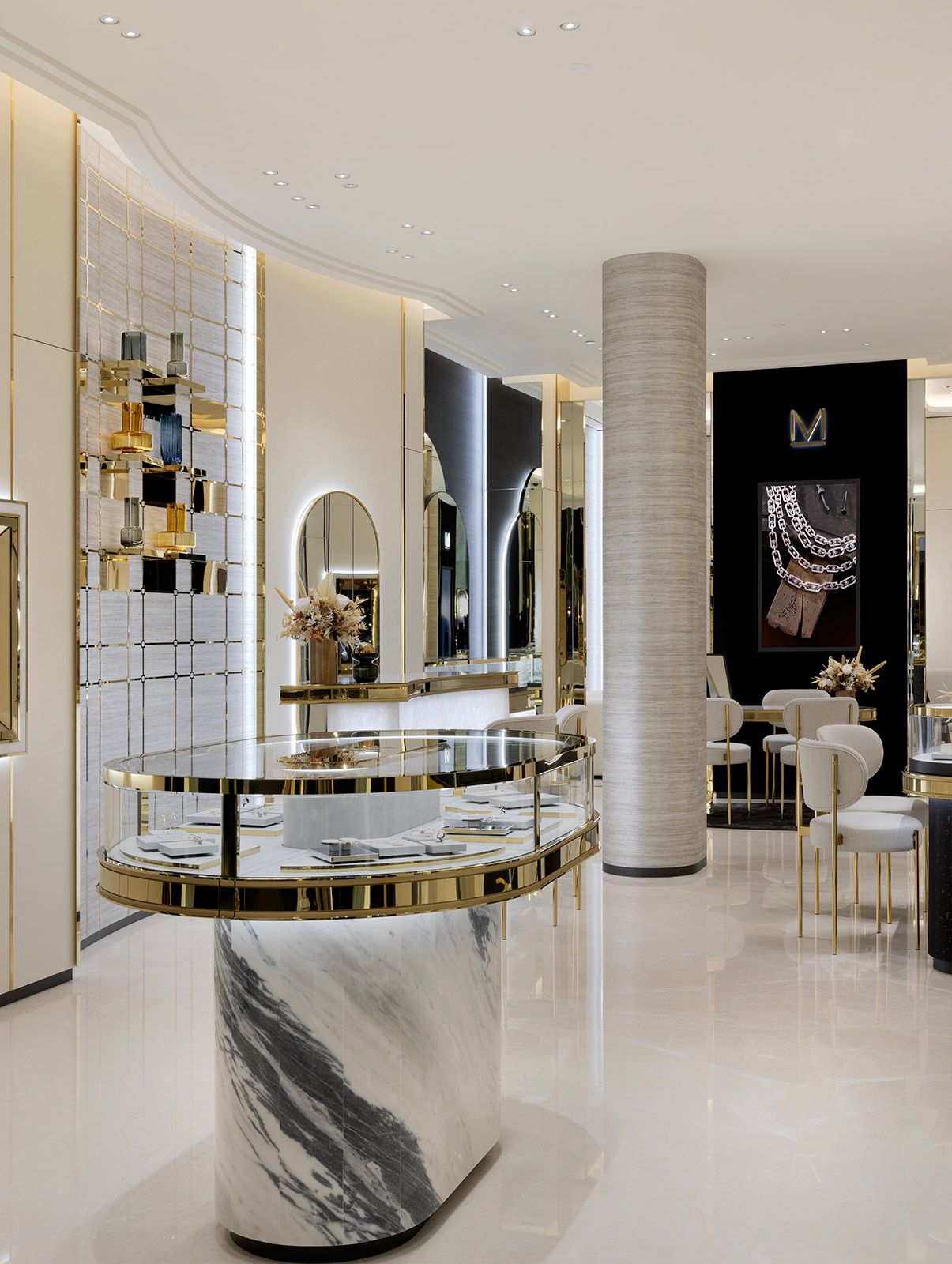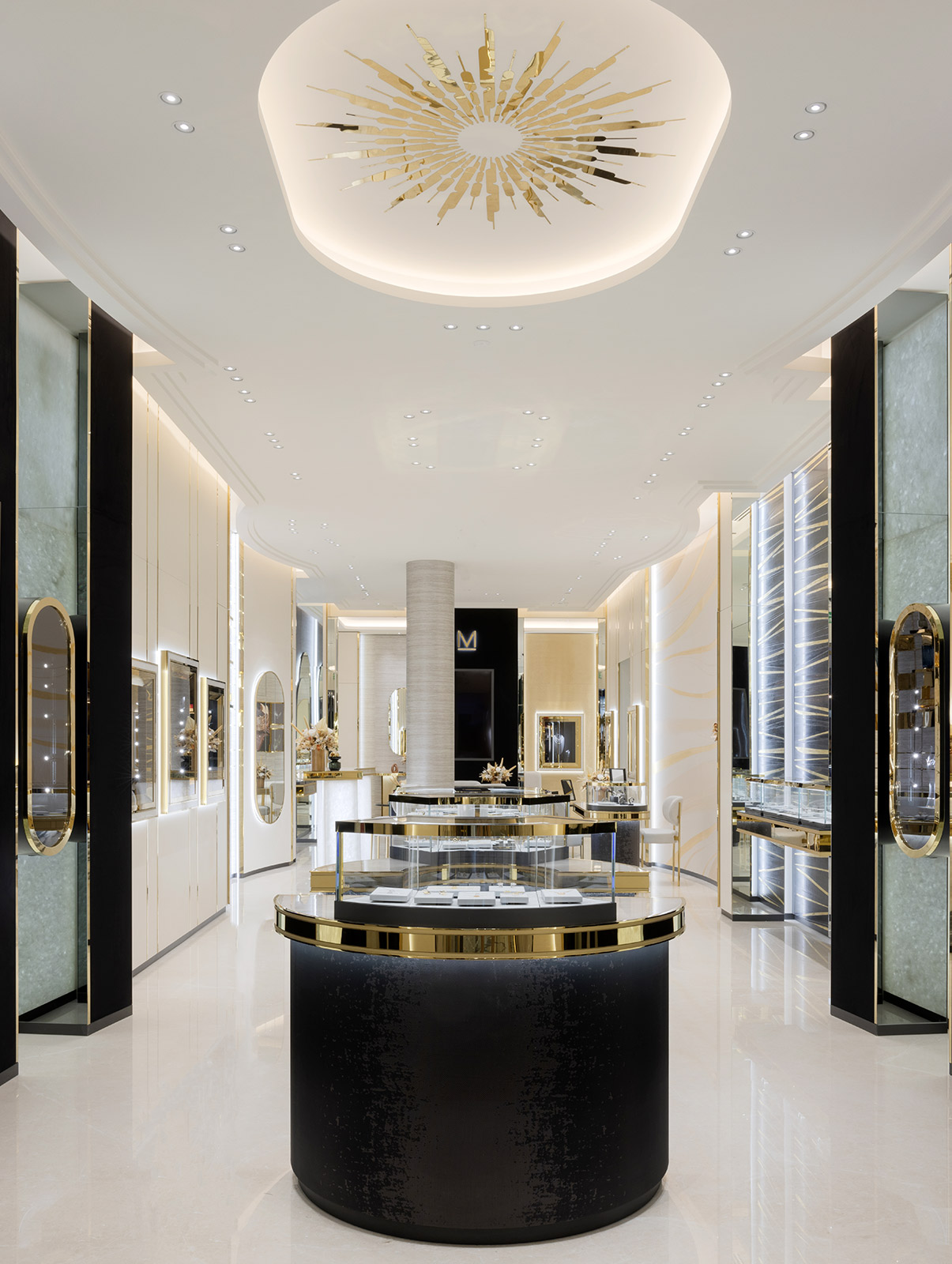 走入店中,宾客将沉浸于高贵奢华的氛围之中,弧形空间设计和精心挑选的室内装潢元素别具一格。精品店设有两间高级珠宝专属贵宾室和一个休闲吧台区,为前来探索Messika梅西卡精美作品的顾客提供私密温馨的环境。该精品店占地127平方米,运用品牌最新设计理念,将奢华的黄金饰面与醒目的黑白对比和谐相融。精致大理石外墙和地板散发华丽气息,引领顾客走进Messika梅西卡珠宝世界,开启一段难忘的旅程。