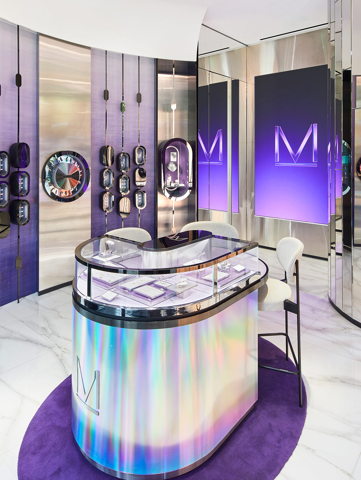 无论是店铺外立面,还是拱廊内部,超大XXL尺寸Move珠宝无处不在,占据了整个空间。橱窗设计延续其标志性线条,创造出独特的“镜中镜”效果,以凸显Messika梅西卡的钻石珠宝。位于高处的圆形Move装饰照亮了整个空间,与中央岛台遥相呼应。
