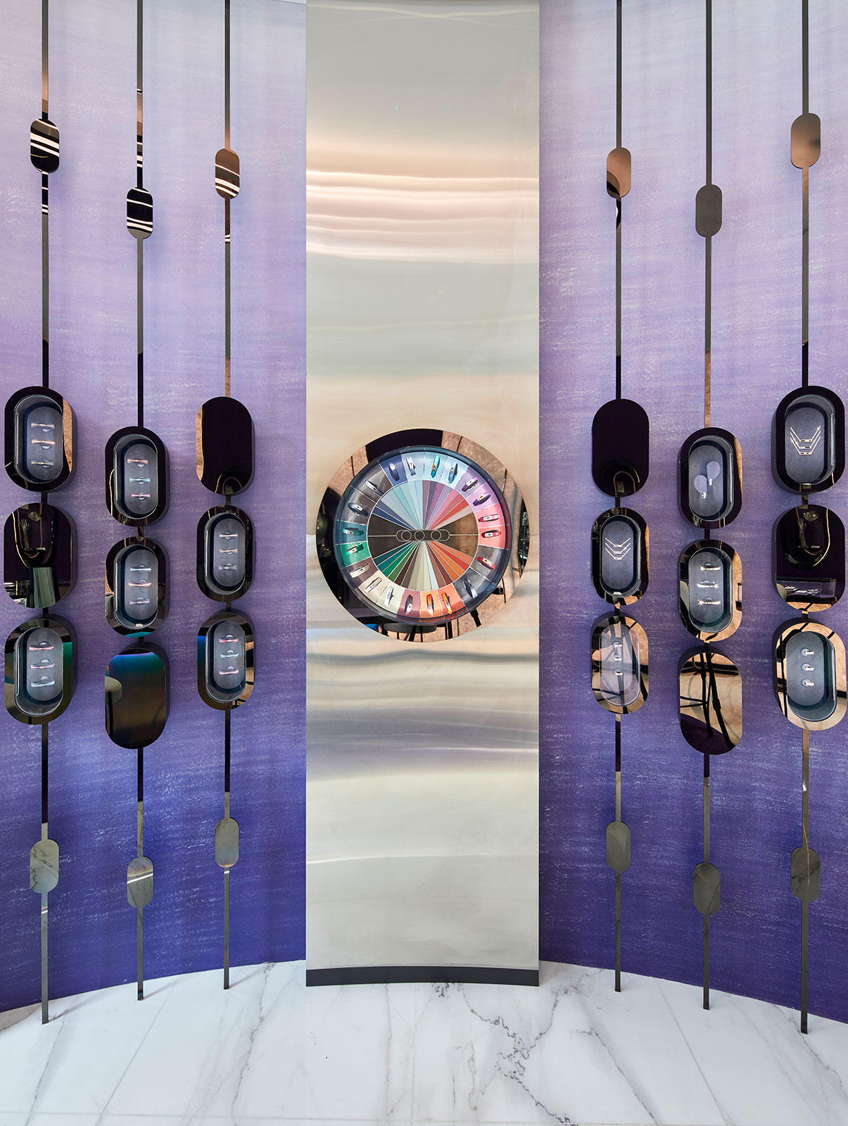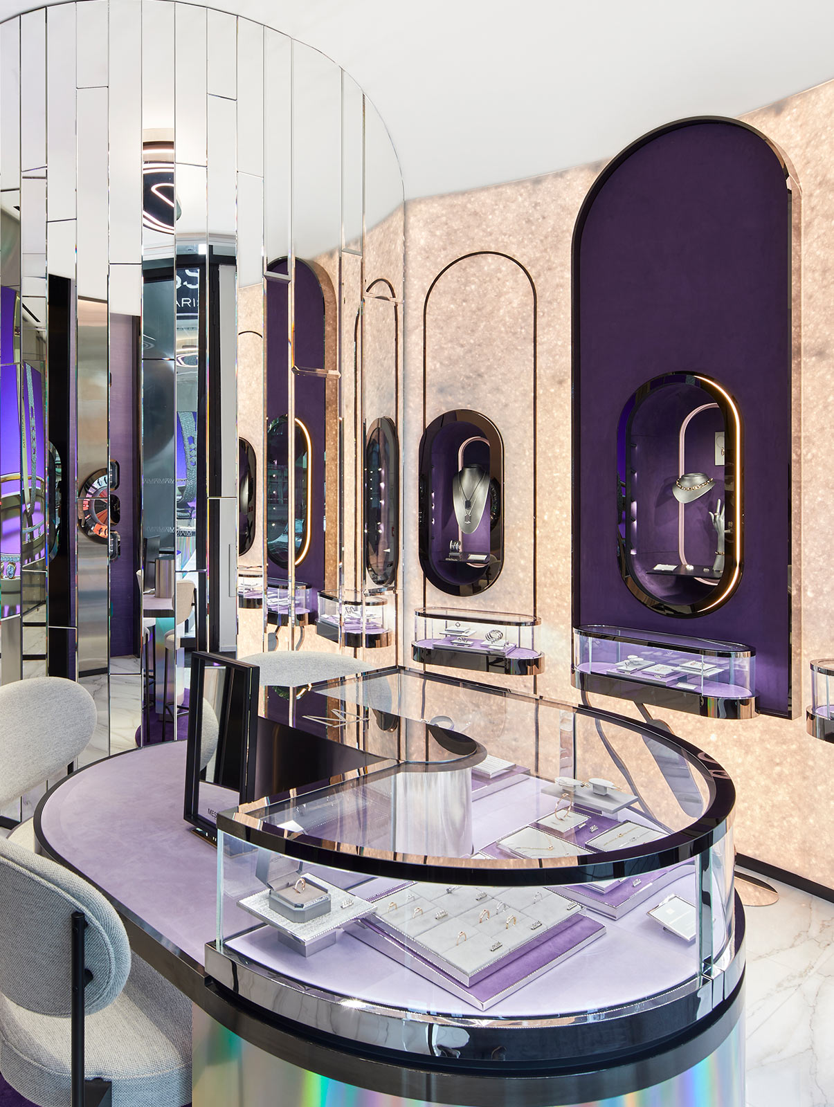 各种形状与色彩的巧妙融合,赋予整个空间以蓬勃生机:大理石、银色铬合金与霓虹紫粉色交织,通过多重反射营造出强烈的视觉冲击力。以独特的方式玩转光影变幻,创造引人瞩目的全新几何图形元素。