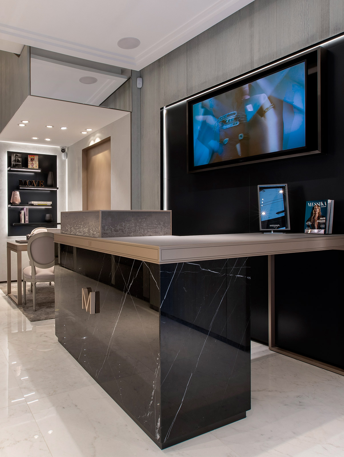 从踏入专卖店的那一刻起,顾客将沉浸于品牌世界之中。Valérie Messika以均匀对称的设计,通透明亮的玻璃橱窗,幽邃深沉的黑色大理石衬托华美钻石的璀璨光芒,为品牌精品珠宝与高级珠宝系列作品营造神奇而迷人的氛围。