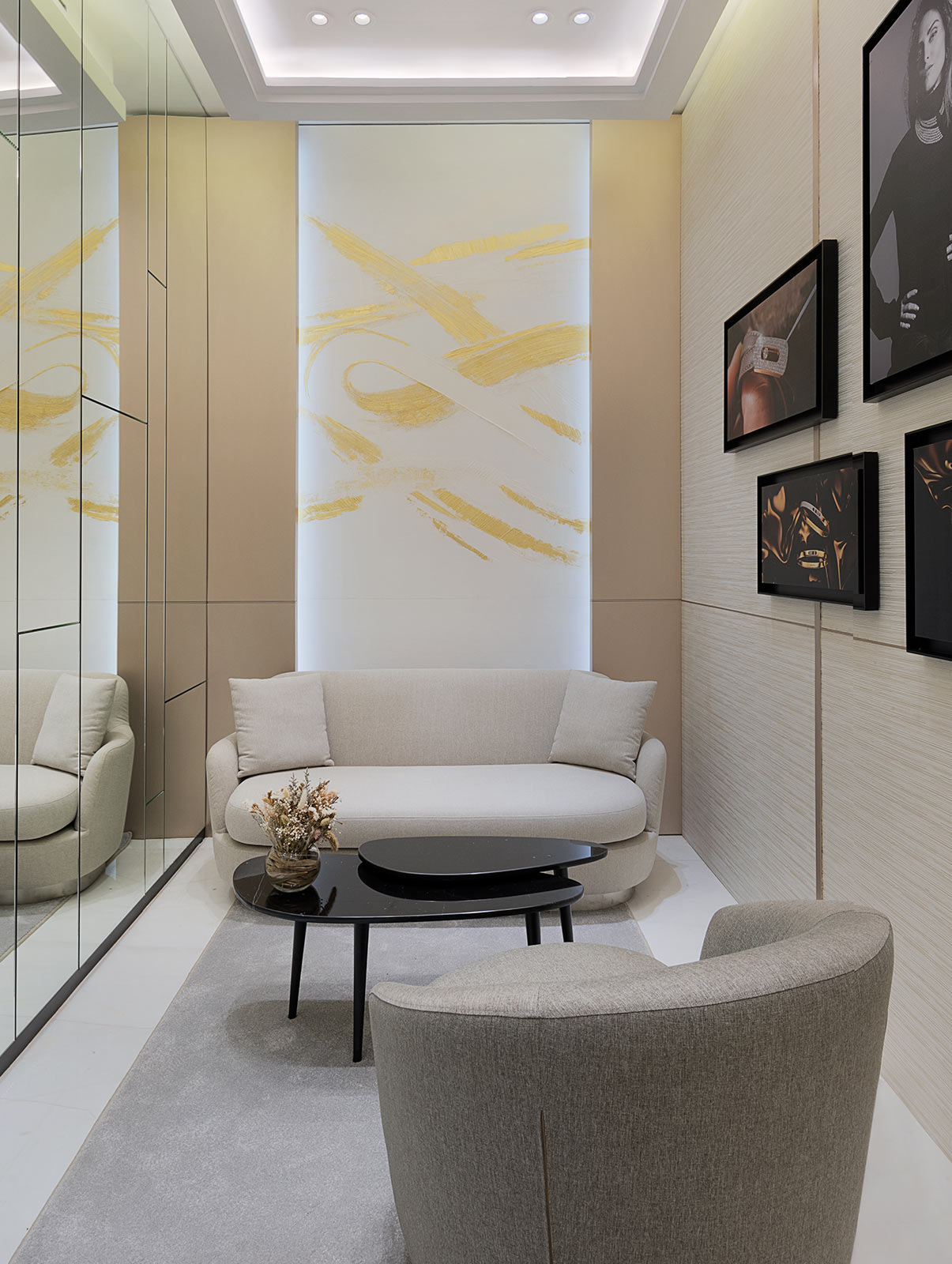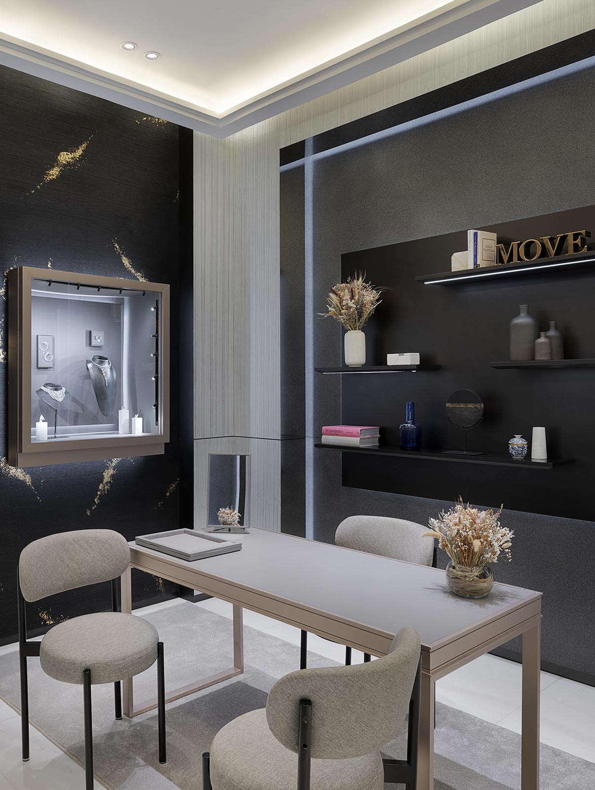 该珠宝店占地70平方米,由Valérie Messika亲自设计,体现品牌价值理念,将奢美与现代特色和灵动创意,纯粹简约的几何线条以及极简风格巧妙结合。从灰色到香槟粉色金属细节,从大理石到斜面镜,各种材质的独特组合令人不由沉浸在Messika梅西卡的珠宝世界中。