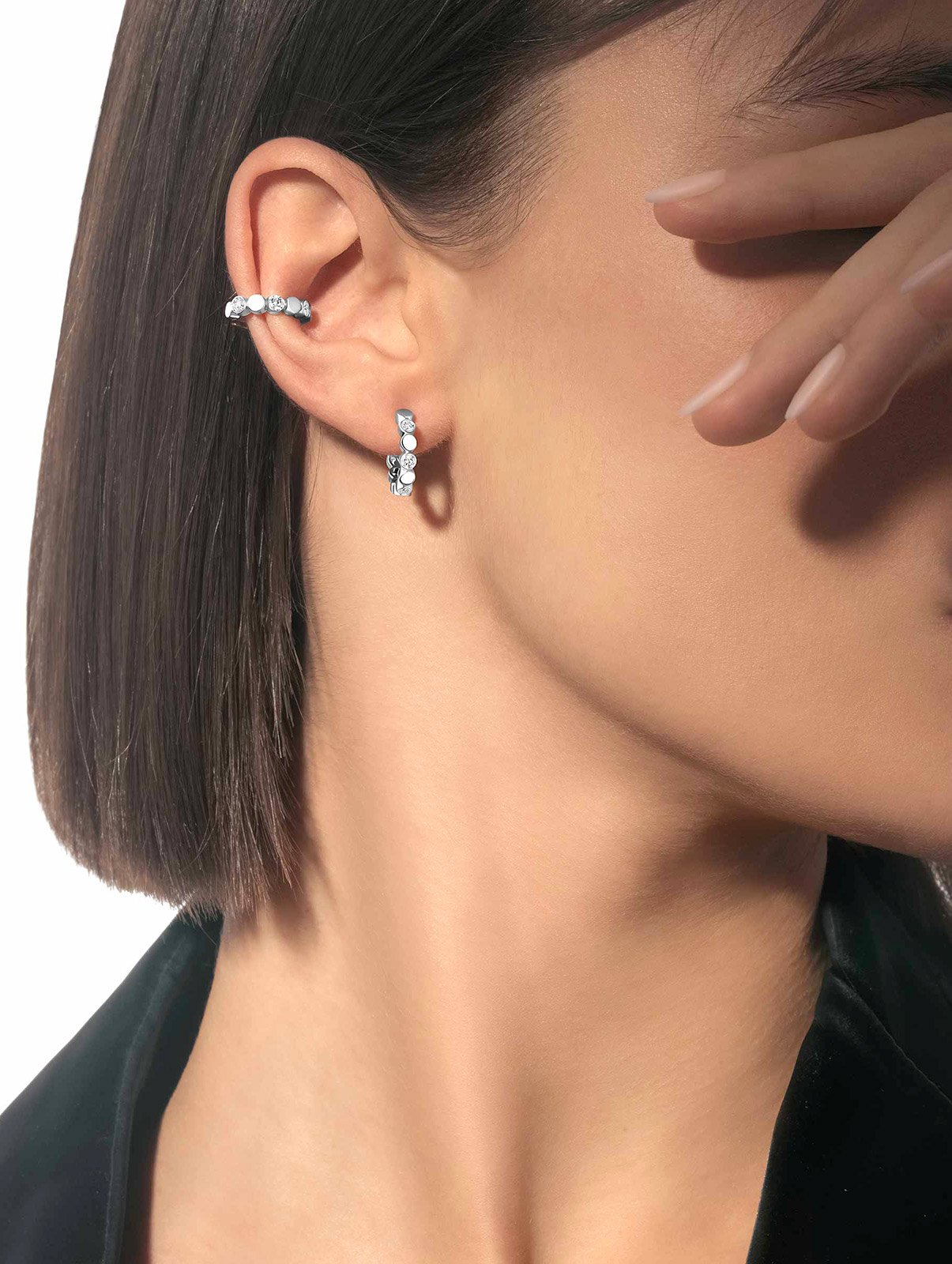 Messika梅西卡颠覆耳环设计!为现代女性开辟新的时尚表达领域,让耳畔从下至上散发迷人魅力。无需穿孔即可轻松夹在耳朵上的耳环已成为您珠宝盒中的必备单品。Messika梅西卡单边钻石耳环实用而舒适,光芒四溢,突破了传统珠宝陈规。D-Vibes单边金质钻石耳夹彰显独特魅力, 熠熠闪耀的金质亮片和璀璨钻石精致点缀耳朵中部。