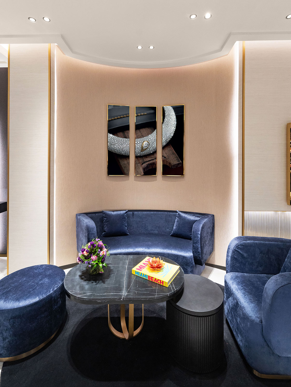 Auf 68 Quadratmetern verbindet die Boutique Pariser Chic und Modernität mit einer Marmorfassade mit goldenen Details, strukturierter Tapete und einem eleganten Loungebereich. Dieses raffinierte Dekor schafft eine warme und elegante Atmosphäre, die für den Stil von Messika charakteristisch ist.
